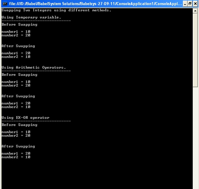 | Console.WriteLine("Swapping Two Integers using different methods.\n"); | |