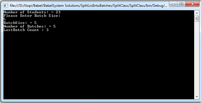 | Console.WriteLine("Number of Batches: = " + lstStudentInBatches.Count); | |