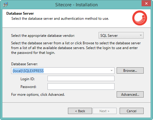 Step 6: Both SQL Server and Oracle are supported. Select the database vendor from dropdown, give the Database server name, and credentials. On click of Advanced settings, we can change Database Prefix, which will be defaulted to previously given Sitecore instance name. Imp Note: Login Id should have admin access enabled in DB server.