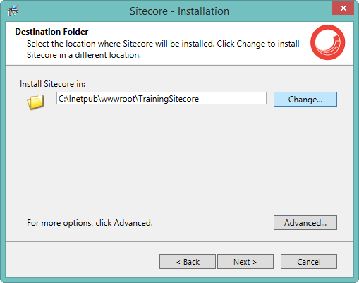 Step 7: Select the IIS root path/wwwroot folder location for Sitecore installation. From Advanced settings, can also select locations for Data, and Database. Click on Next -> to proceed.